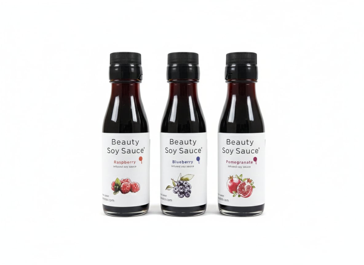 This set includes three varieties of Beauty Soy Sauce infused with fruit flavors — Apple, Banana, and Grape.