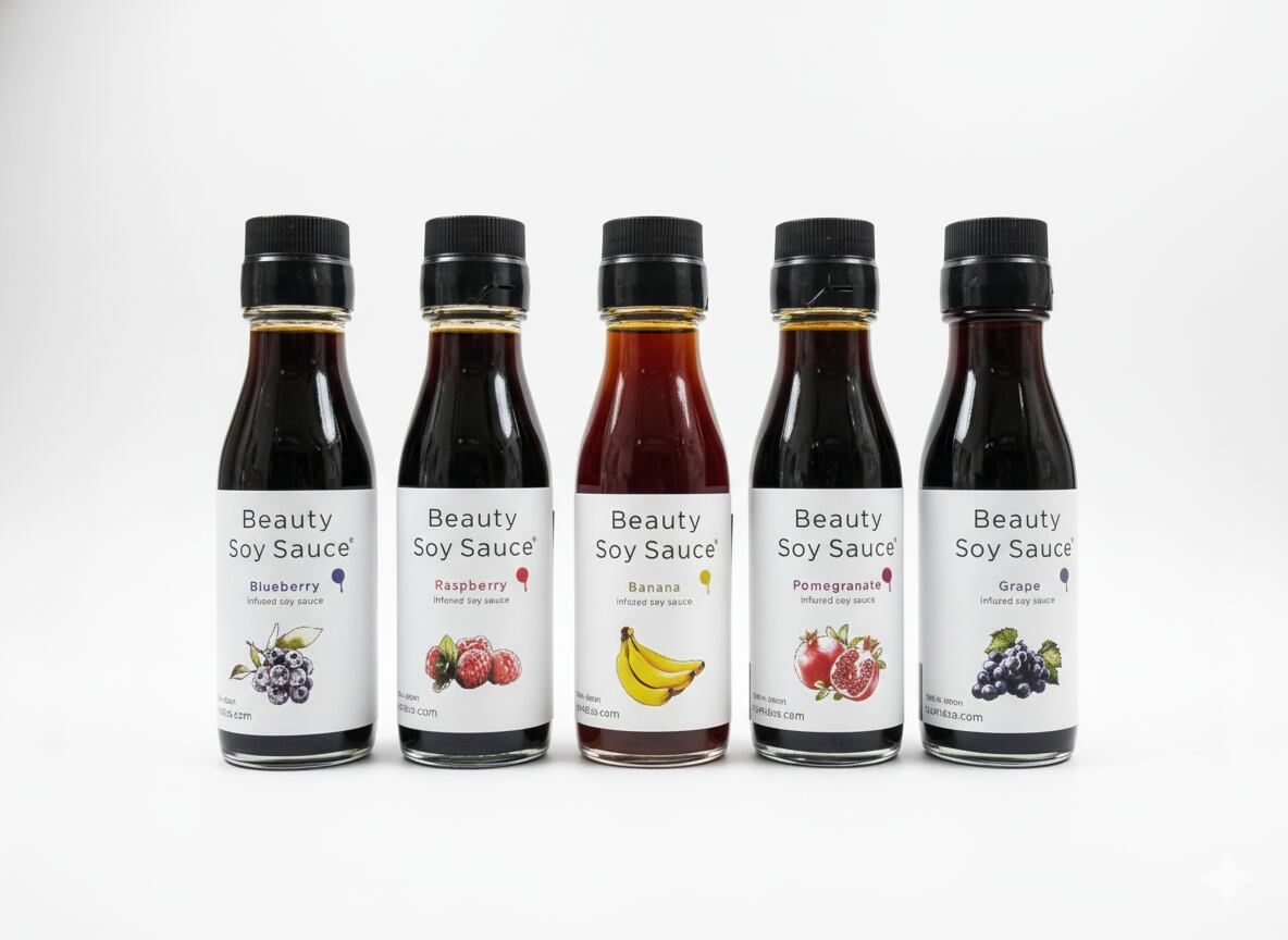 This special Beauty Soy Sauce Gift Set includes five fruit-infused flavors — Blueberry, Raspberry, Banana, Pomegranate, and Grape.